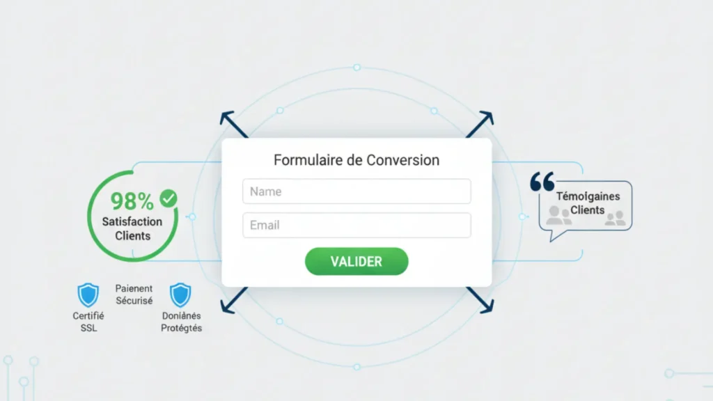 • Badges et Certifications : Affichez les logos de sécurité, les badges de garantie (ex: garantie de remboursement, données sécurisées) pour rassurer l’utilisateur avant qu’il ne clique sur le CTA.